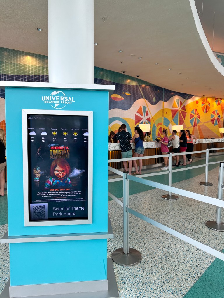 It’s HHN season at Universal Studios Orlando and this year Cabana Bay is offering a special Halloween experience called Chucky’s Twisted Playground. It’s located on the second floor of the lobby building in the Fun in the Sun Rec Center, between the Fitness Center and Galaxy Bowl.