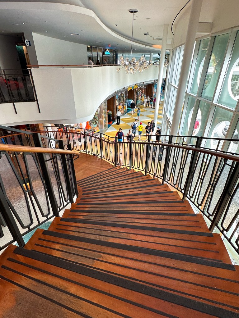 At the bottom of this spiraling staircase is a Starbucks Coffee, which is located between the main lobby and Bayliner Diner.