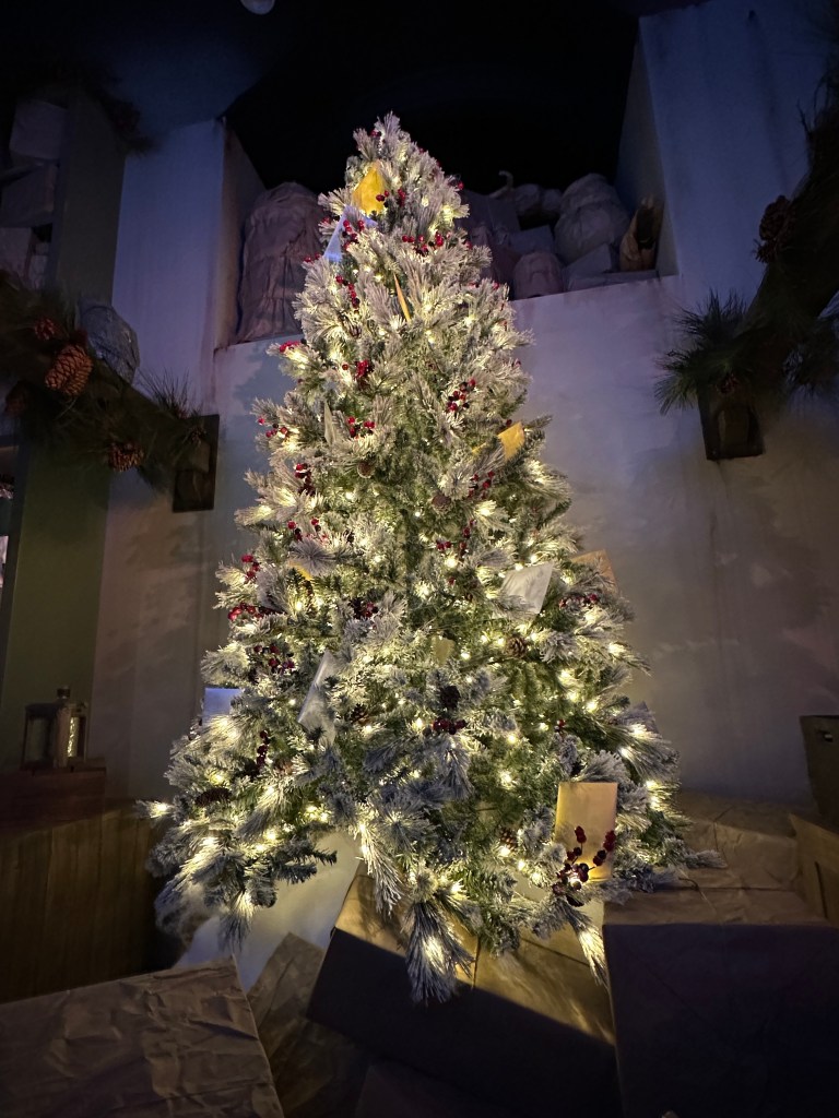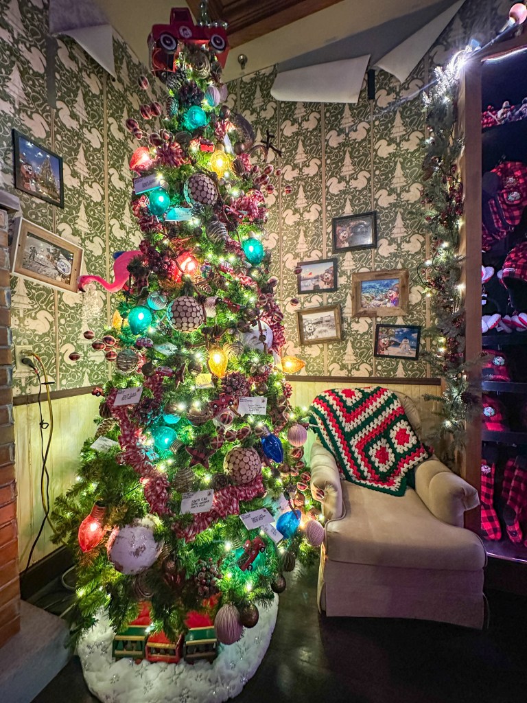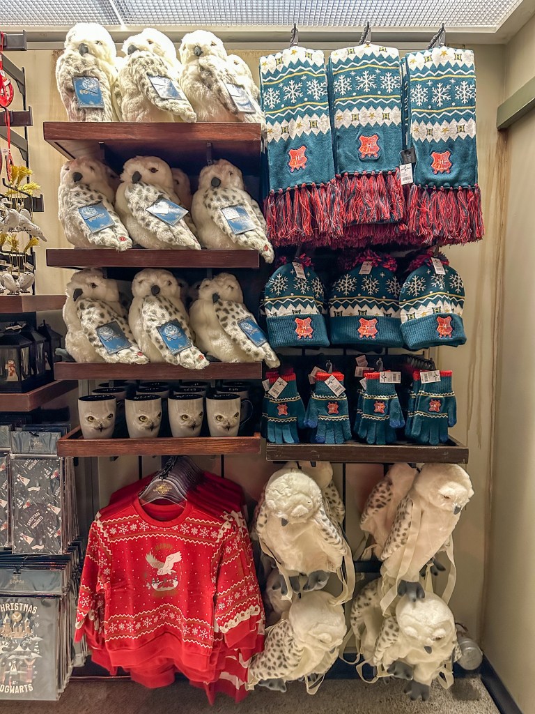 The second room is my personal favorite, the Owl Post from Hogsmeade Village. The lighting is moody and the entire area is filled with amazing wizarding world decor and merch. There’s a beautifully lit Christmas tree with mounds of brown paper wrapped gifts under it near the center.
