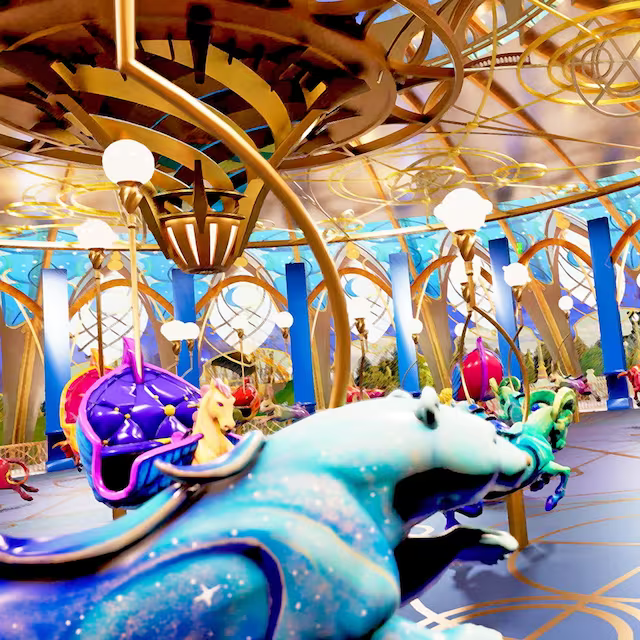 From ceiling to floor Constellation Carousel is filled with artistic details inspired by mythical creatures and the cosmos. The guest carriages will lift six feet into the air, rotate 360° and include unicorns, dragons, rams and more. The ceiling is designed as a star tracker containing star patterns that move and rotate. A ribbon cone effect is created by a center Mesmerizer, which will add a cool visual effect while riding.